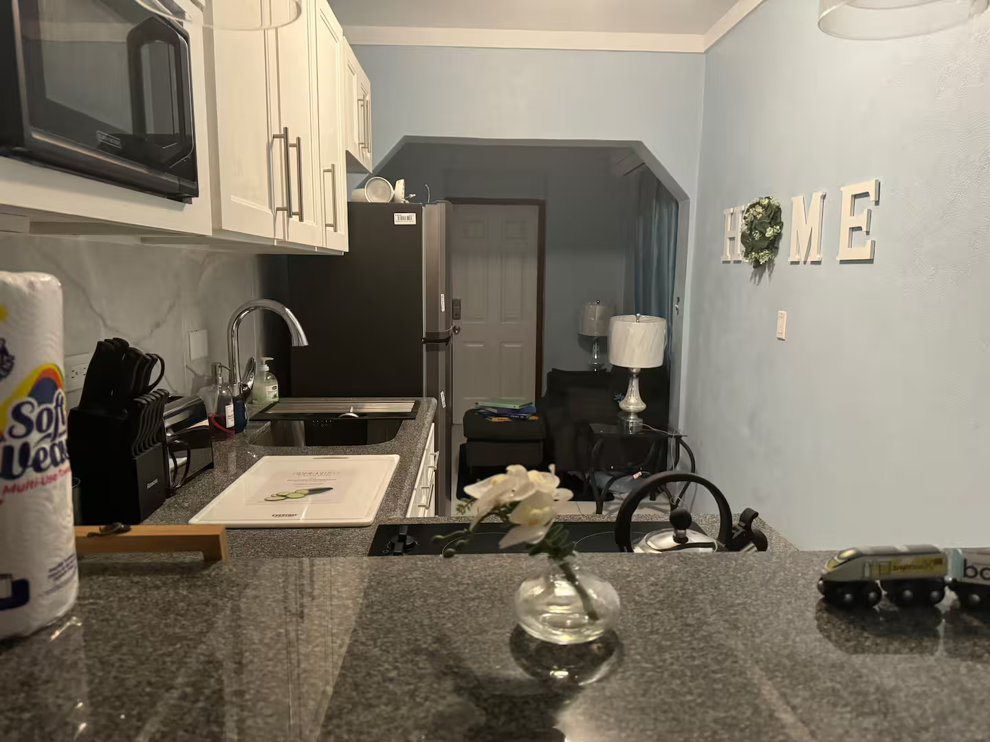 Enjoy a queen-size pillow-top bed, a fully equipped kitchen with countertop stove, refrigerator, and microwave, plus a living room, private bathroom, and private entrance for added comfort and privacy.